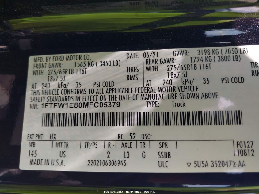 2021 FORD F-150 | 1FTFW1E80MFC05379