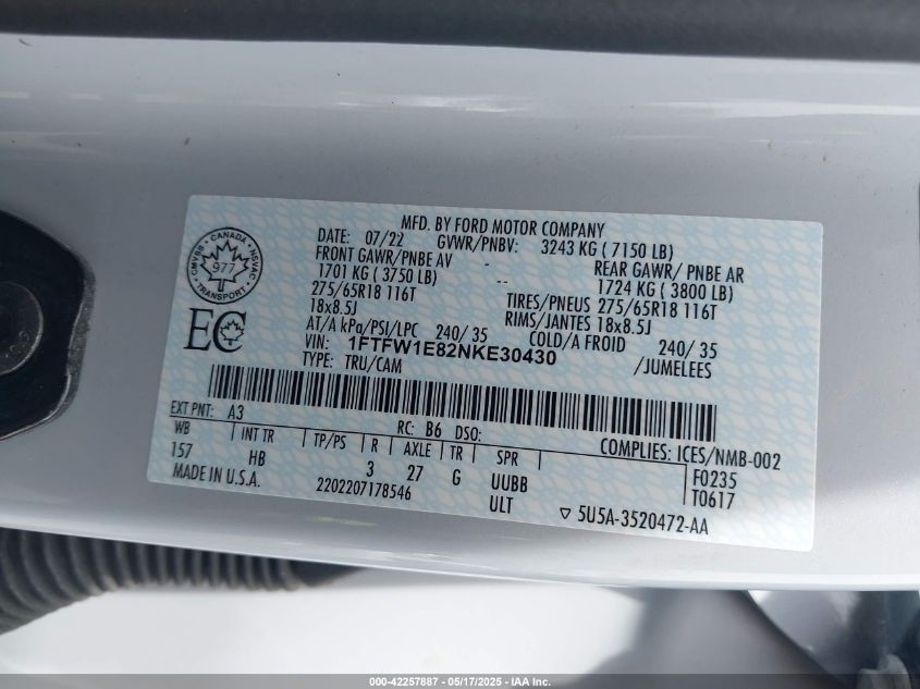 2022 FORD F-150 | 1FTFW1E82NKE30430
