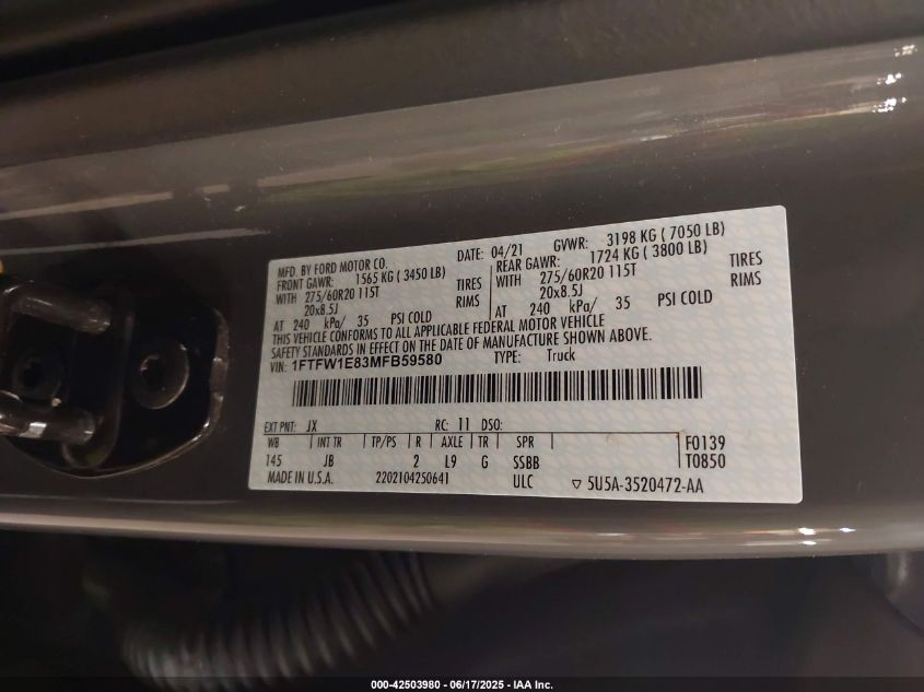 2021 FORD F-150 | 1FTFW1E83MFB59580