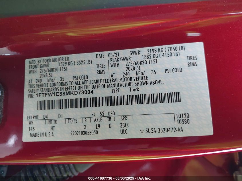 2021 FORD F-150 | 1FTFW1E88MKD73004
