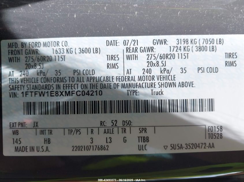 2021 FORD F-150 | 1FTFW1E8XMFC04210