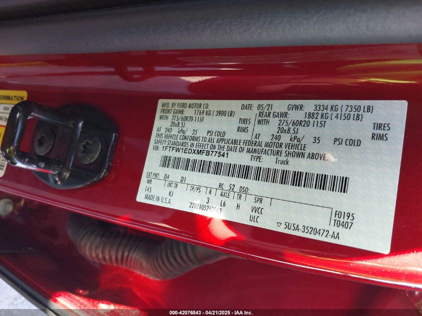 2021 FORD F-150 | 1FTFW1EDXMFB77541