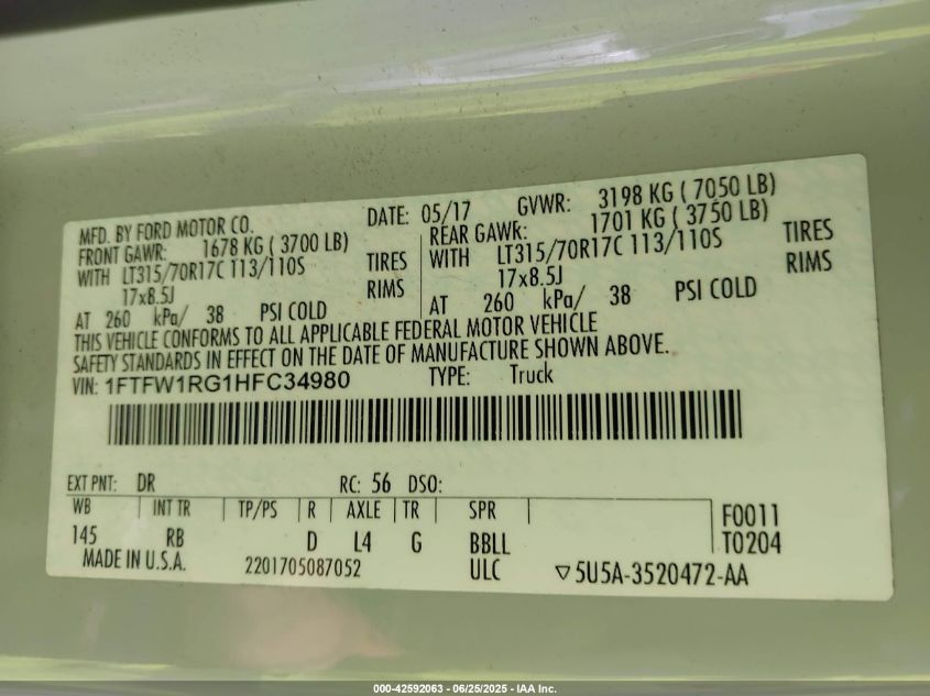 2017 FORD F-150 | 1FTFW1RG1HFC34980