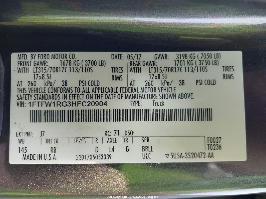 2017 FORD F-150 | 1FTFW1RG3HFC20904