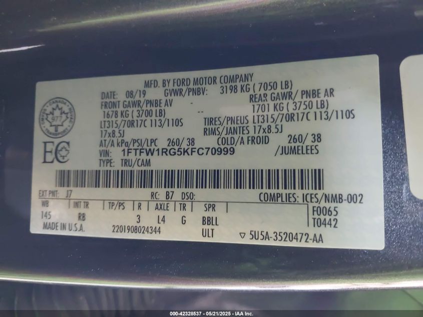 2019 FORD F-150 | 1FTFW1RG5KFC70999