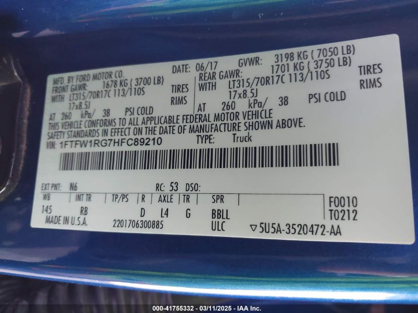 2017 FORD F-150 | 1FTFW1RG7HFC89210