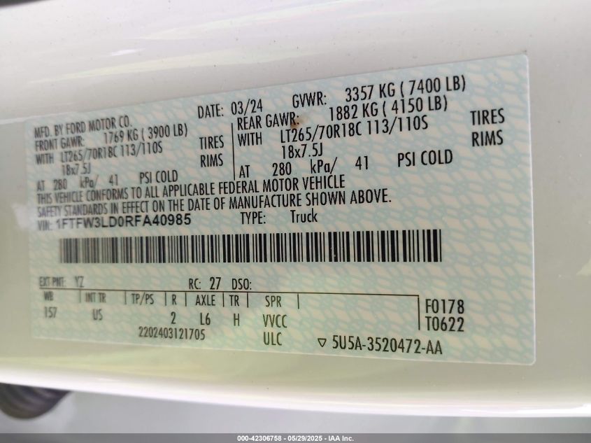 2024 FORD F-150 | 1FTFW3LD0RFA40985