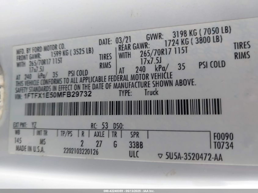 2021 FORD F-150 | 1FTFX1E50MFB29732