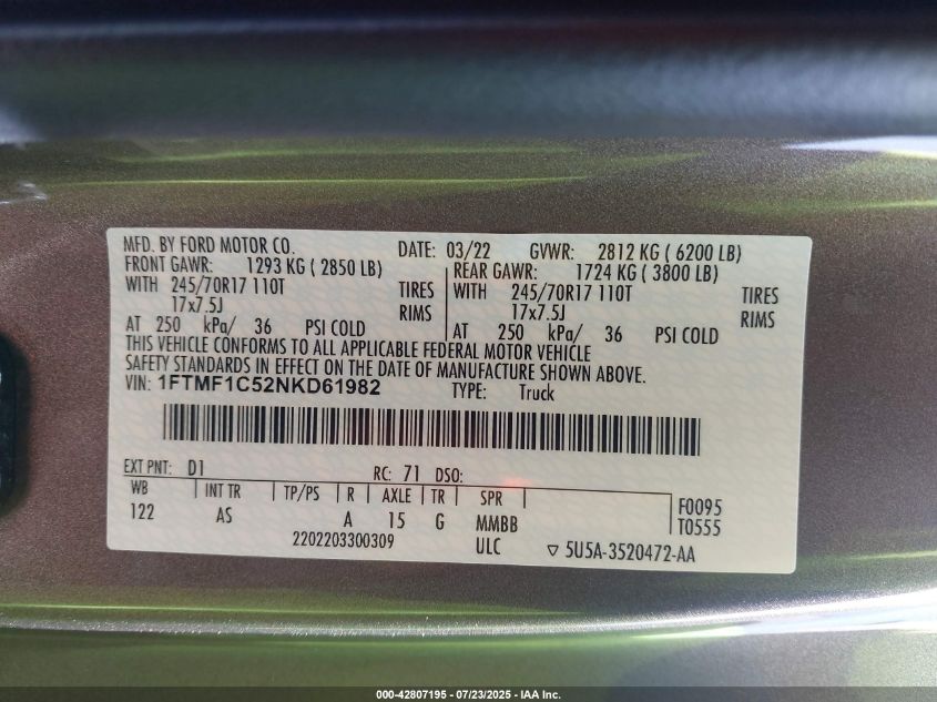 2022 FORD F-150 | 1FTMF1C52NKD61982