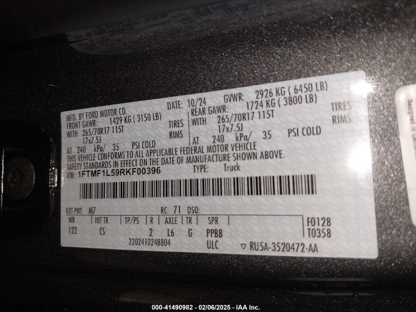 2024 FORD F-150 | 1FTMF1L59RKF00396
