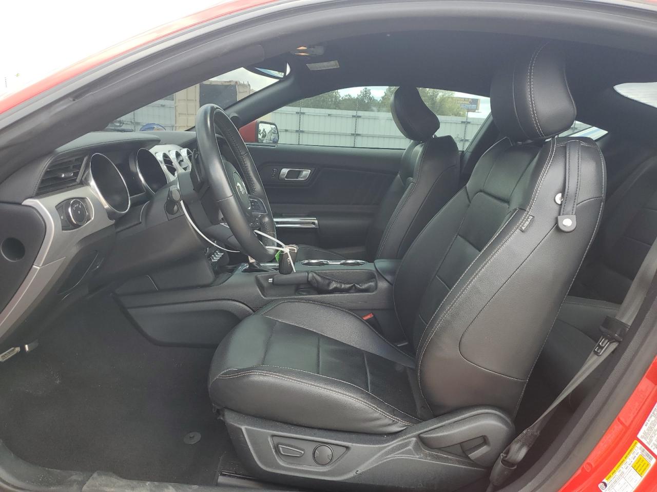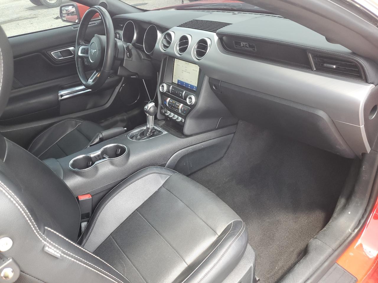 Inside, the Mustang transitioned from basic cloth seats in EcoBoost models to leather-appointed, heated, and ventilated performance seats in GT, Mach 1, and Shelby variants. Special Recaro sport bucket seats were optional on higher-performance models, providing enhanced lateral support for spirited driving. Interior trims varied from simple brushed aluminum in base trims to carbon fiber, suede, and exclusive GT350/GT500 signature plaques in performance variants. The cockpit emphasized driver-centric ergonomics, featuring a 12-inch fully digital instrument cluster on higher trims, SYNC 3 infotainment systems with Apple CarPlay and Android Auto, and optional Bang & Olufsen premium audio systems for an immersive experience.