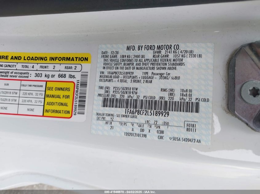 2020 FORD MUSTANG | 1FA6P8CF2L5189929