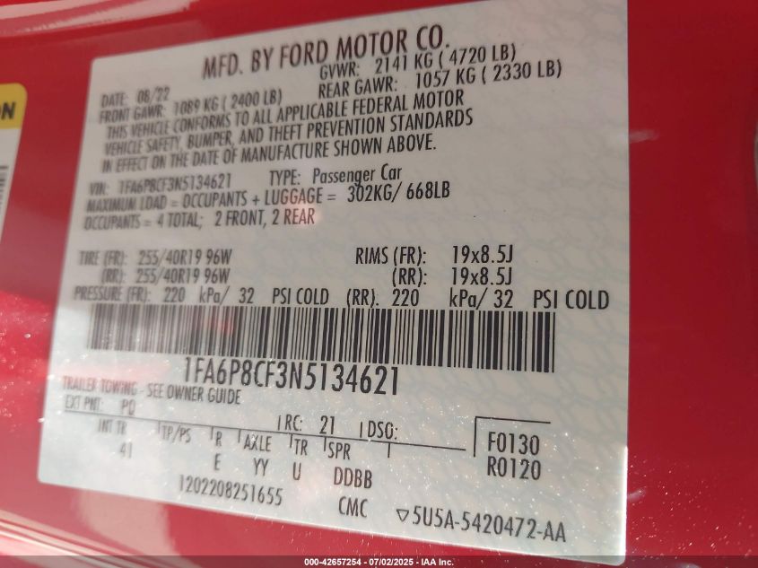 2022 FORD MUSTANG | 1FA6P8CF3N5134621