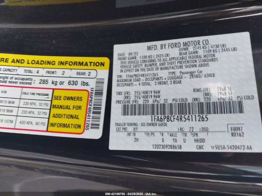 2024 FORD MUSTANG | 1FA6P8CF4R5411265