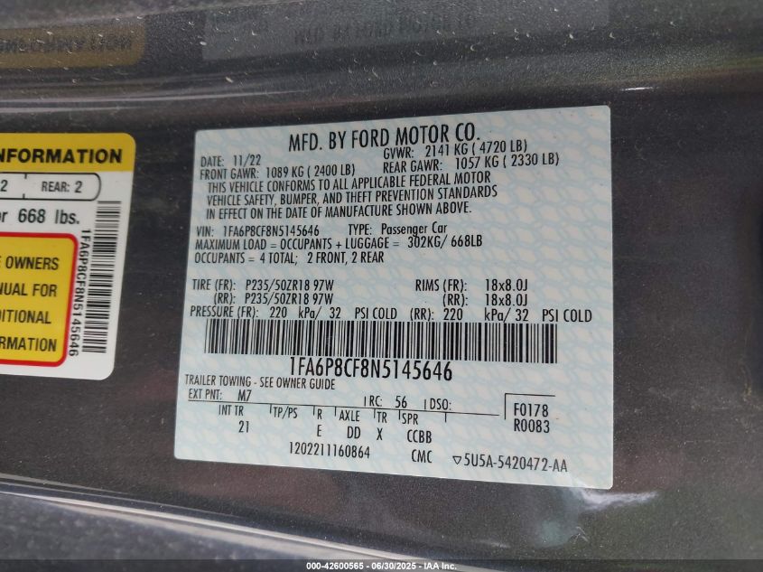 2022 FORD MUSTANG | 1FA6P8CF8N5145646