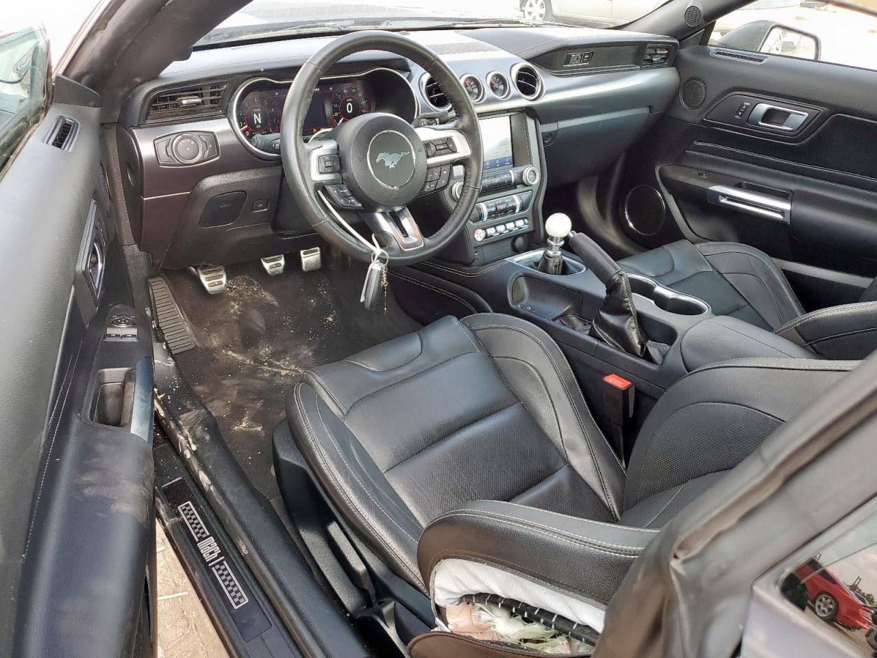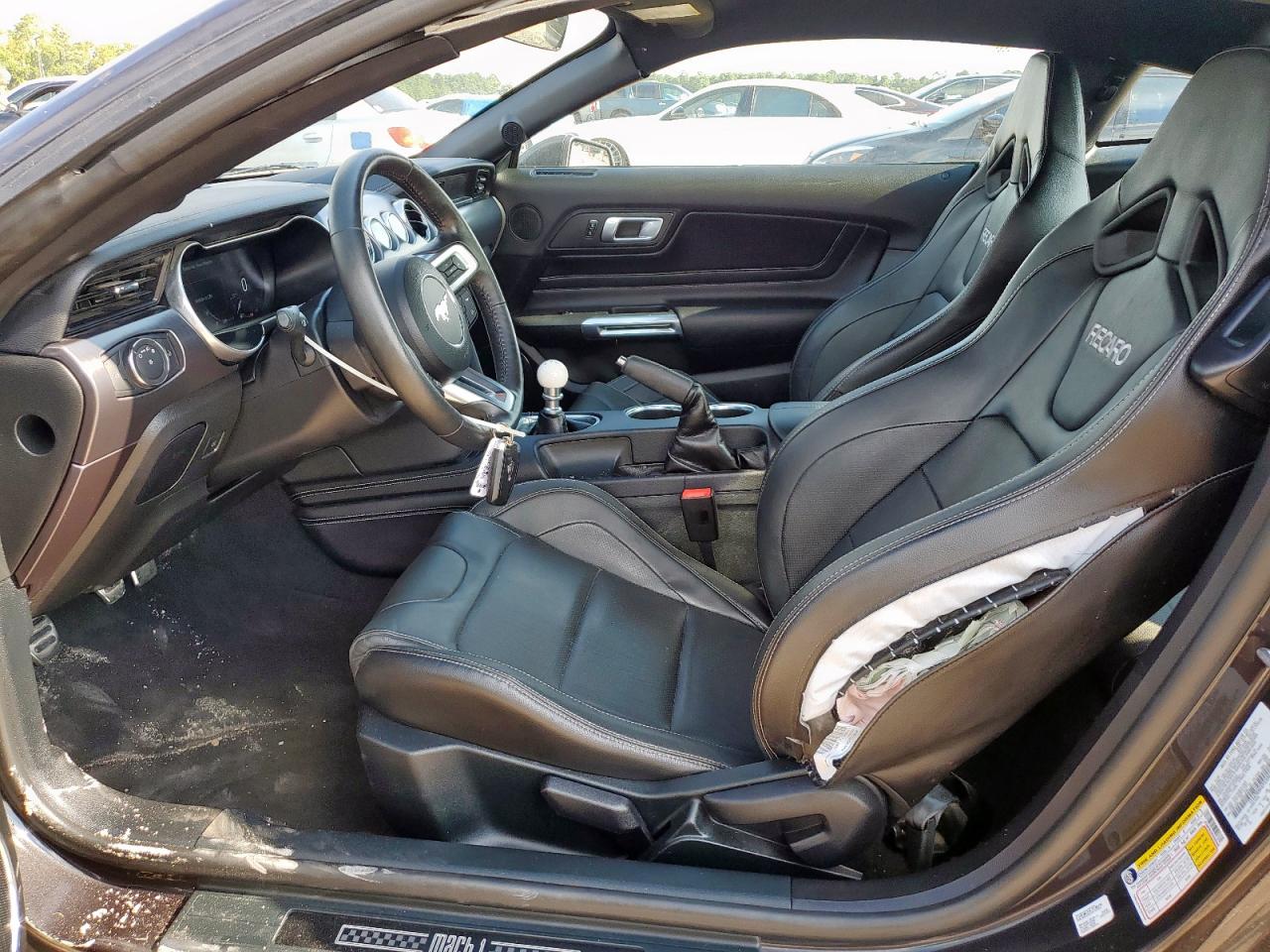 Inside, the Mustang transitioned from basic cloth seats in EcoBoost models to leather-appointed, heated, and ventilated performance seats in GT, Mach 1, and Shelby variants. Special Recaro sport bucket seats were optional on higher-performance models, providing enhanced lateral support for spirited driving. Interior trims varied from simple brushed aluminum in base trims to carbon fiber, suede, and exclusive GT350/GT500 signature plaques in performance variants. The cockpit emphasized driver-centric ergonomics, featuring a 12-inch fully digital instrument cluster on higher trims, SYNC 3 infotainment systems with Apple CarPlay and Android Auto, and optional Bang & Olufsen premium audio systems for an immersive experience.