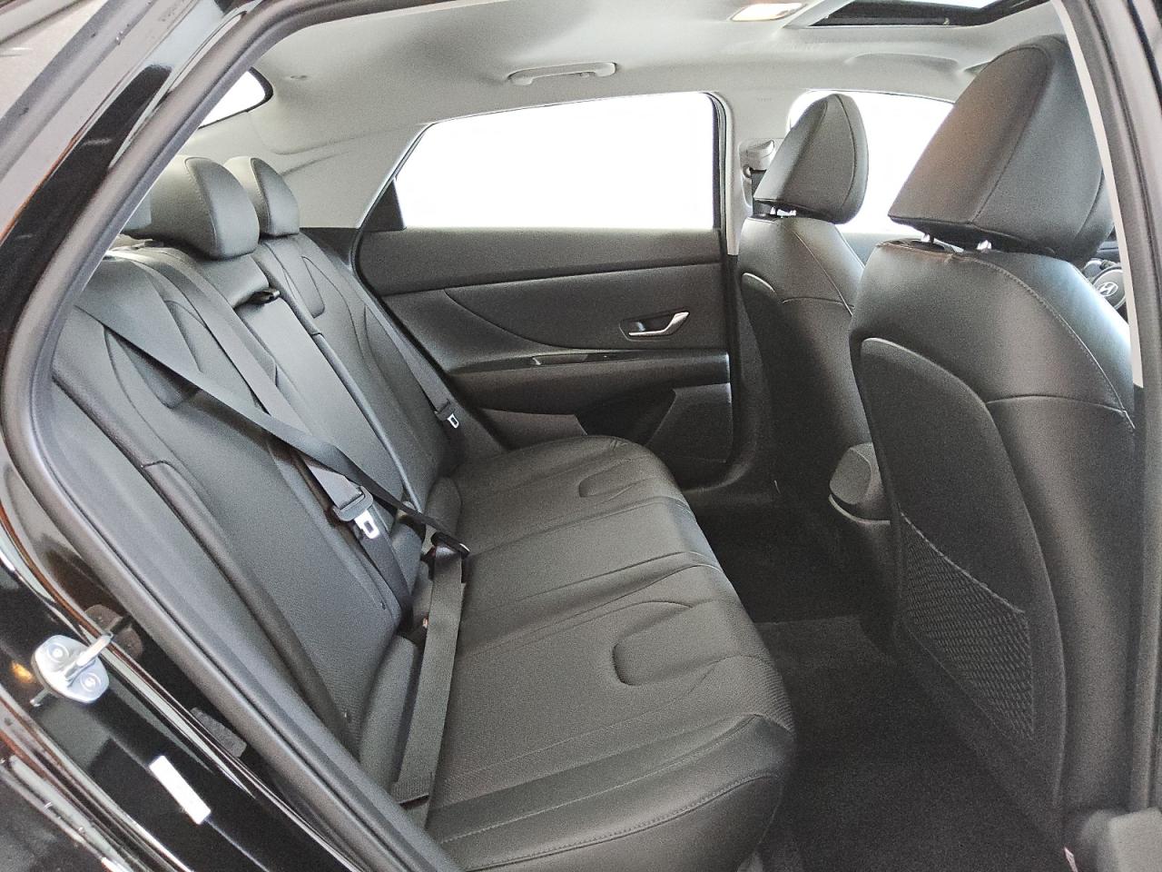 The Hyundai Elantra is a compact four-door sedan with a dramatic fastback profile and angular surface treatment. Its low roofline, aggressive proportions, and extended wheelbase give it a more coupe-like silhouette, breaking away from the conservative sedan mold. Characterized by sharp creases, triangular body panels, and a prominent parametric grille, the design projects boldness and technical sophistication. The rear adopts a distinctive H-shaped taillight layout stretching across the trunk, a ducktail-style lip, and a wide stance that enhances its sporty attitude. Despite the sleek roofline, the elongated proportions ensure solid rear-seat headroom and class-leading interior space, making it practical as well as stylish.