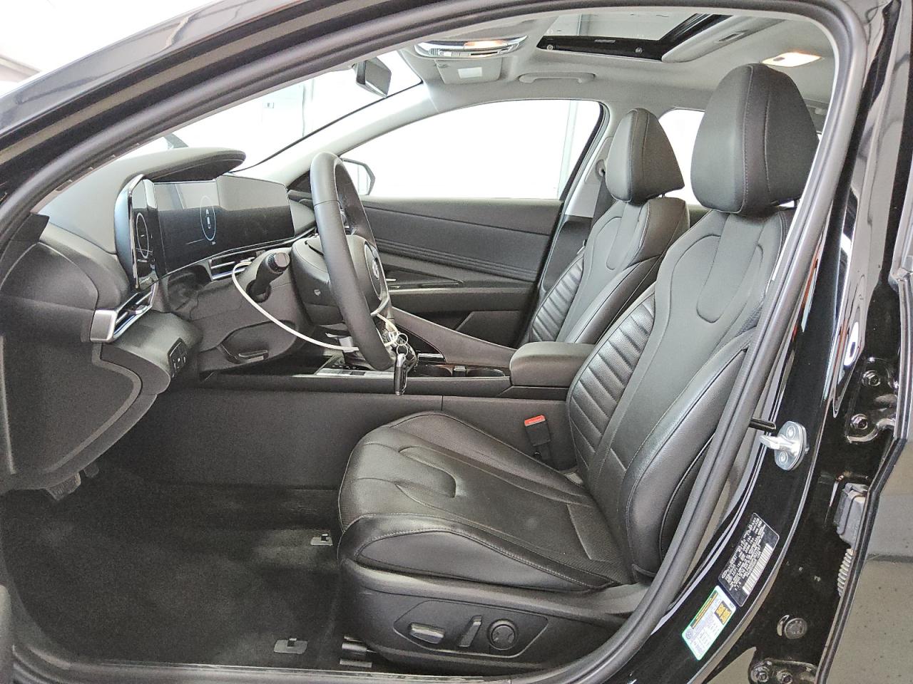 Inside, base trims offer woven or soft cloth upholstery in black or gray tones. Mid and upper trims introduce premium synthetic leather, two-tone interiors, and stitched accents. The Elantra N features aggressive sport bucket seats with integrated headrests, illuminated logos, and suede-like inserts for lateral grip. Cabin design emphasizes a “driver cocoon” layout with a wraparound dashboard, dual digital displays (10.25-inch each on higher trims), ambient lighting, and aircraft-style ventilation controls. Red accents and metal pedals differentiate the N trims, while Limited models focus on sophistication with silver trim and optional dark teal interior themes.