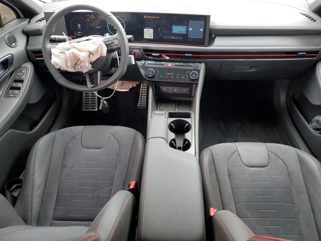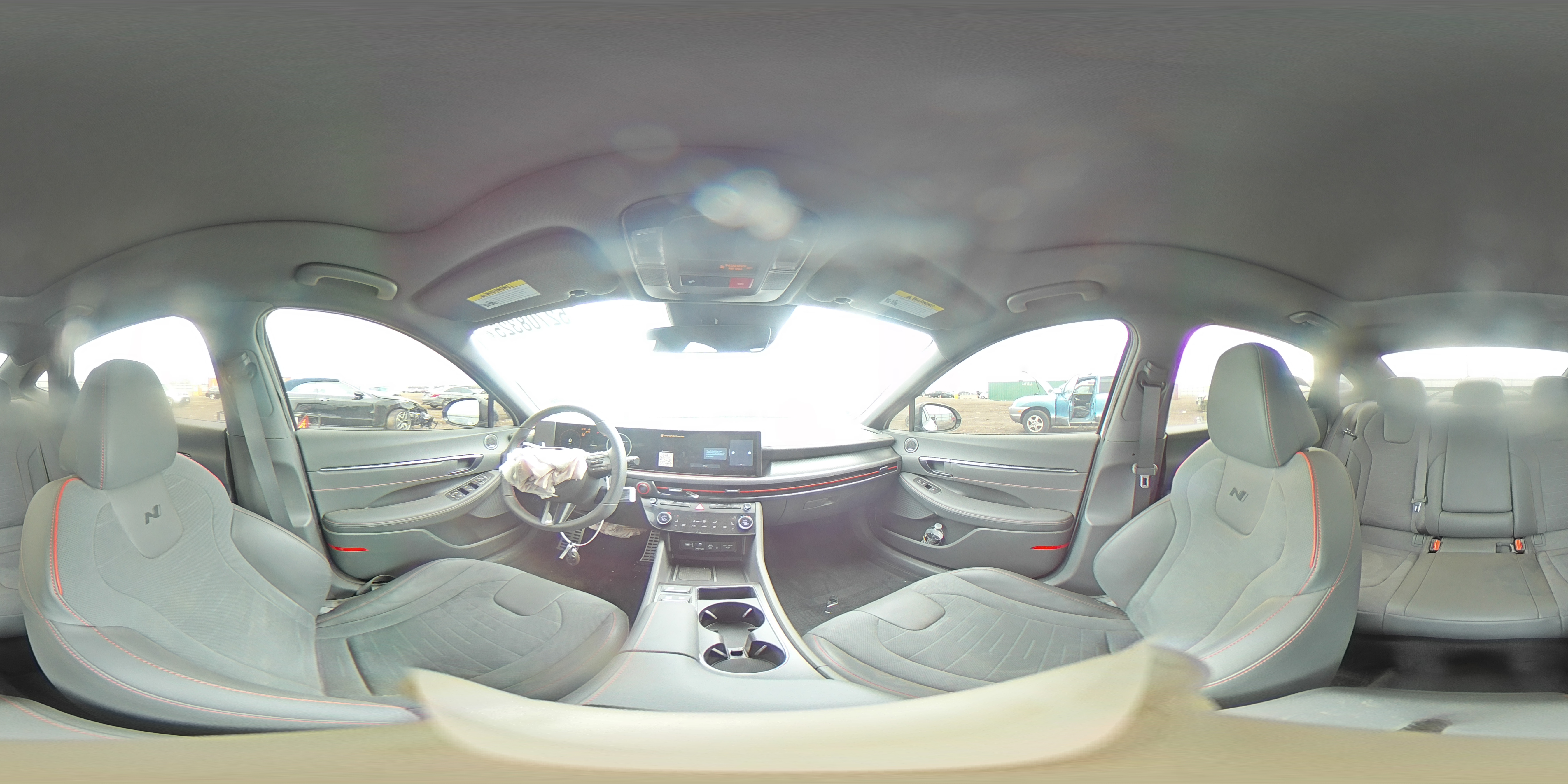 Inside, the cabin can be optioned with Black, Light Gray, or Dark Navy interiors in cloth, leatherette, or full leather, depending on trim. The N Line version features sport seats with red contrast stitching, suede inserts, and embroidered logos, while hybrid variants use eco-processed leather and offer a unique solar panel roof in certain trims. The dashboard layout is wide and low, featuring a digital cluster and floating infotainment screen with a wraparound design. Ambient lighting and bronze or satin metal trim accents vary across trims, enhancing the upscale, driver-focused layout.