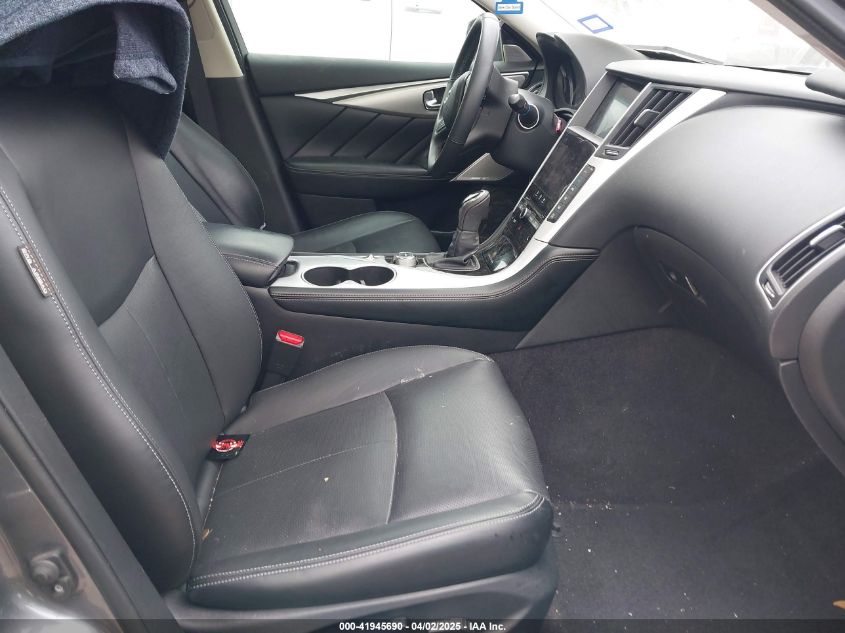 Inside, the Q50 combined traditional Japanese craftsmanship with modern luxury. Leather-appointed seating was available in Graphite, Stone, Java, and Gallery White. Red Sport models introduced Quilted Graphite Leather or semi-aniline Gallery White with red stitching, along with dark chrome or textured aluminum accents.