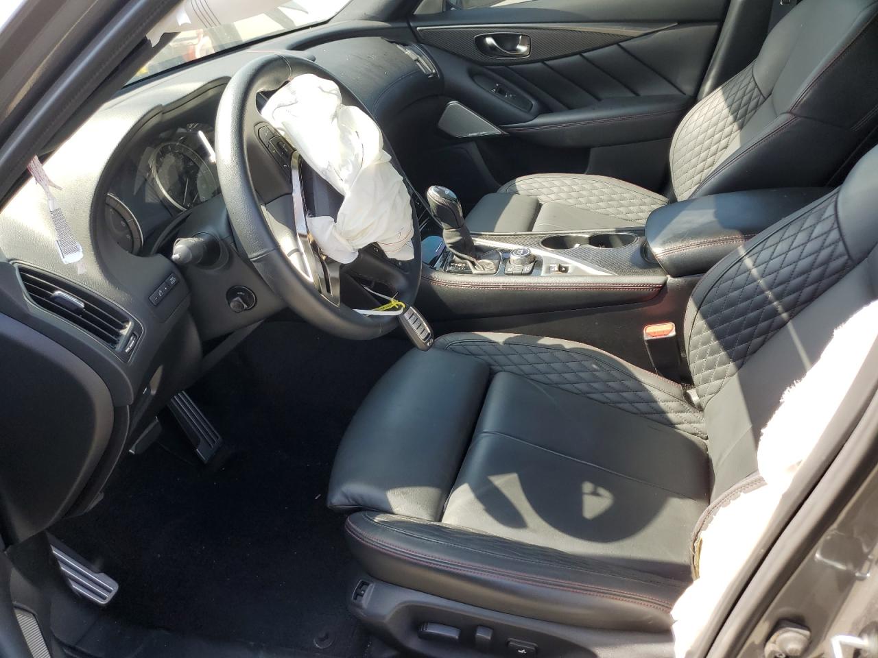 Inside, the Q50 combined traditional Japanese craftsmanship with modern luxury. Leather-appointed seating was available in Graphite, Stone, Java, and Gallery White. Red Sport models introduced Quilted Graphite Leather or semi-aniline Gallery White with red stitching, along with dark chrome or textured aluminum accents.
