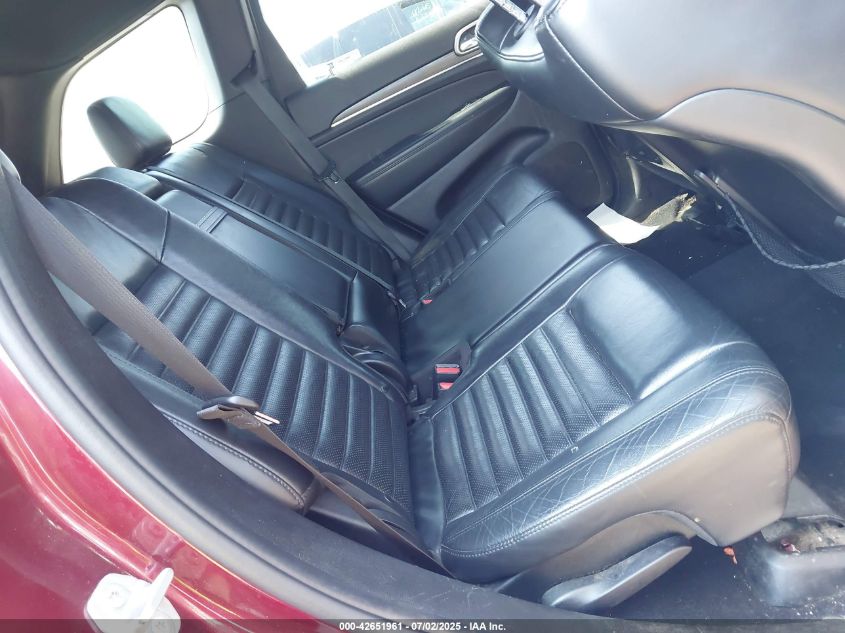 Interior options ranged from cloth (Laredo) to premium Nappa or Laguna leather (Summit, Overland, SRT). Color themes included Morocco Black, Light Frost Beige, and Indigo/Ski Grey. Summit models offered open-pore wood, suede headliners, and stitched dash panels. Rear entertainment, panoramic sunroof, and real wood trim were common in top trims.