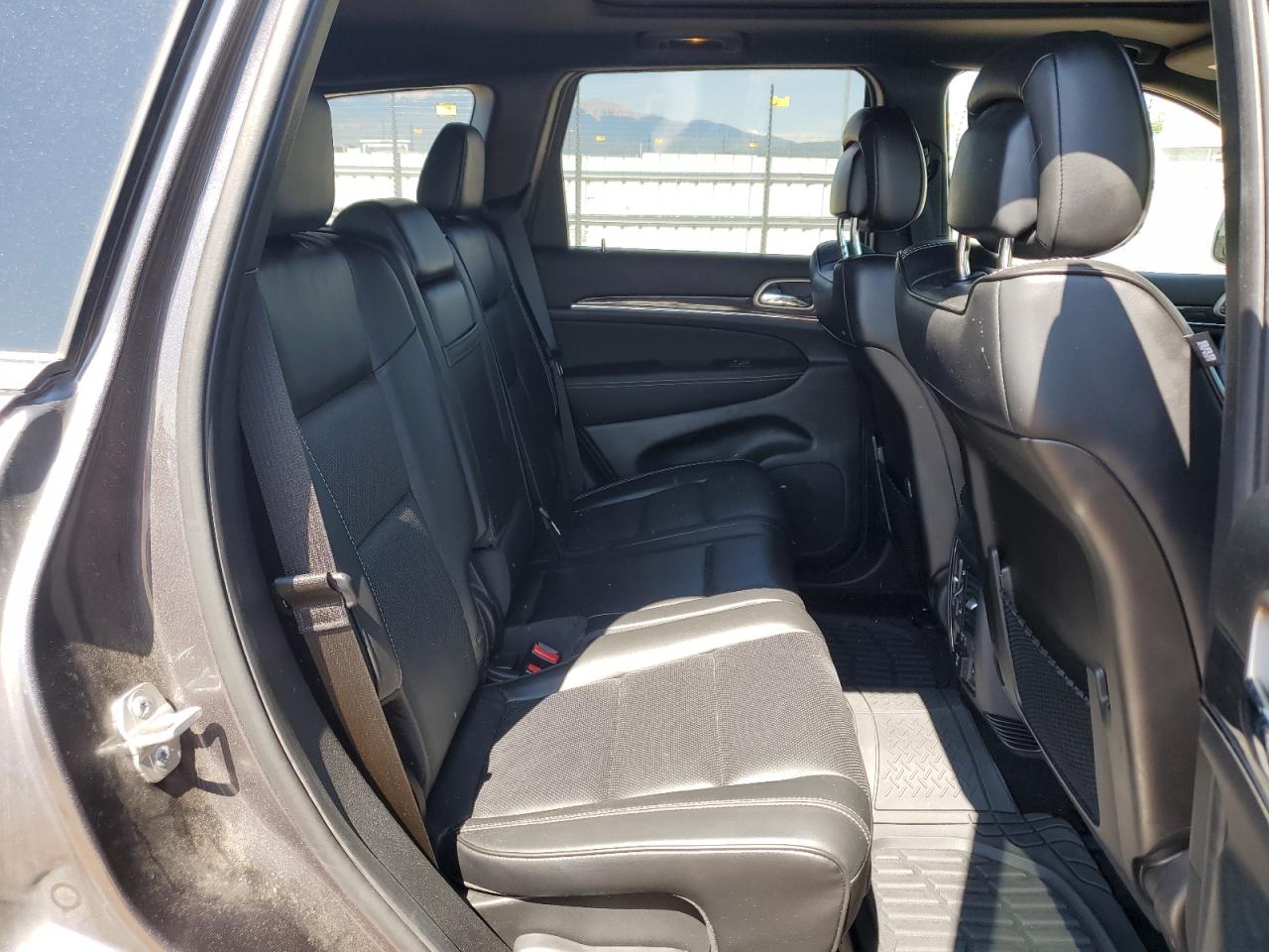 Interior options ranged from cloth (Laredo) to premium Nappa or Laguna leather (Summit, Overland, SRT). Color themes included Morocco Black, Light Frost Beige, and Indigo/Ski Grey. Summit models offered open-pore wood, suede headliners, and stitched dash panels. Rear entertainment, panoramic sunroof, and real wood trim were common in top trims.