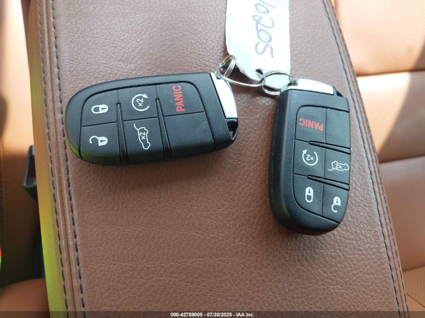Interior options ranged from cloth (Laredo) to premium Nappa or Laguna leather (Summit, Overland, SRT). Color themes included Morocco Black, Light Frost Beige, and Indigo/Ski Grey. Summit models offered open-pore wood, suede headliners, and stitched dash panels. Rear entertainment, panoramic sunroof, and real wood trim were common in top trims.