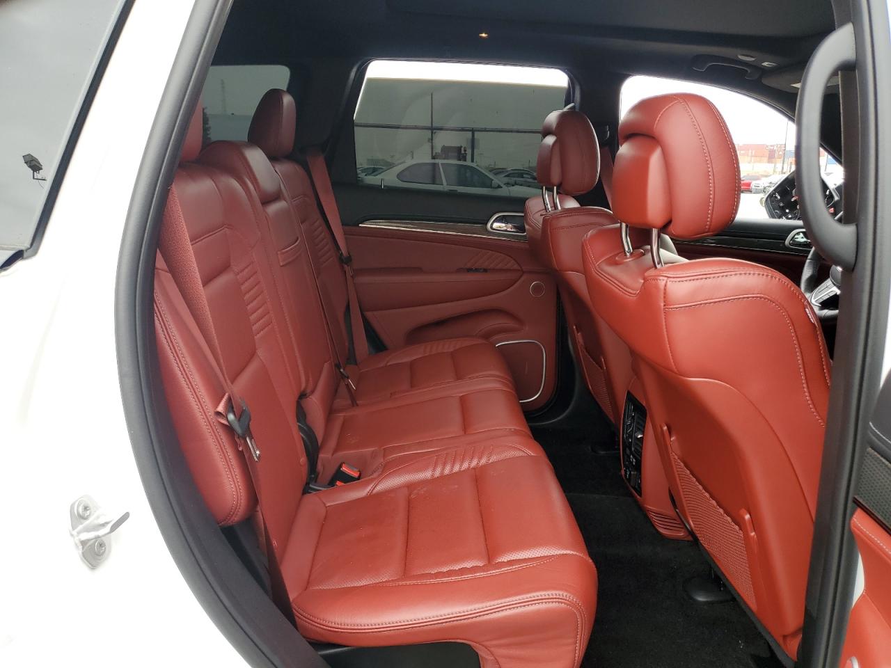 Interior options ranged from cloth (Laredo) to premium Nappa or Laguna leather (Summit, Overland, SRT). Color themes included Morocco Black, Light Frost Beige, and Indigo/Ski Grey. Summit models offered open-pore wood, suede headliners, and stitched dash panels. Rear entertainment, panoramic sunroof, and real wood trim were common in top trims.