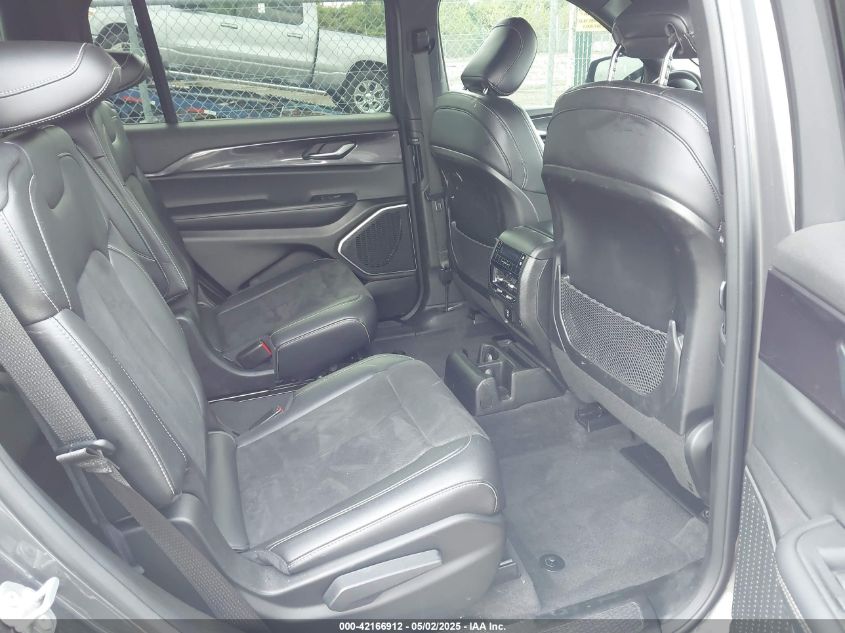 Interior options ranged from cloth (Laredo) to premium Nappa or Laguna leather (Summit, Overland, SRT). Color themes included Morocco Black, Light Frost Beige, and Indigo/Ski Grey. Summit models offered open-pore wood, suede headliners, and stitched dash panels. Rear entertainment, panoramic sunroof, and real wood trim were common in top trims.