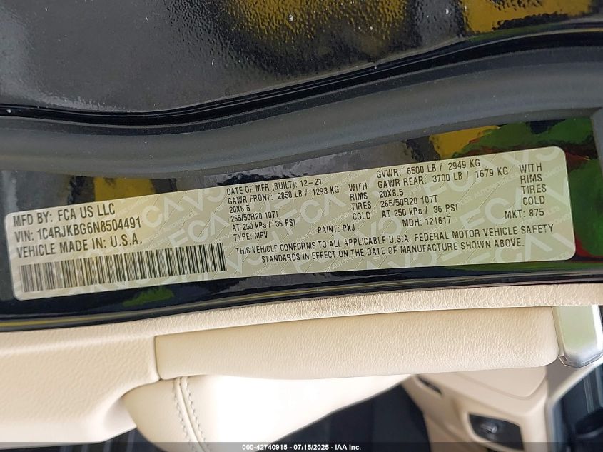 2022 JEEP GRAND CHEROKEE L | 1C4RJKBG6N8504491