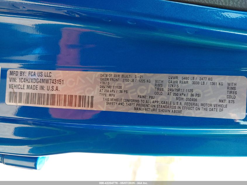 2021 JEEP WRANGLER | 1C4HJXDG4MW743151