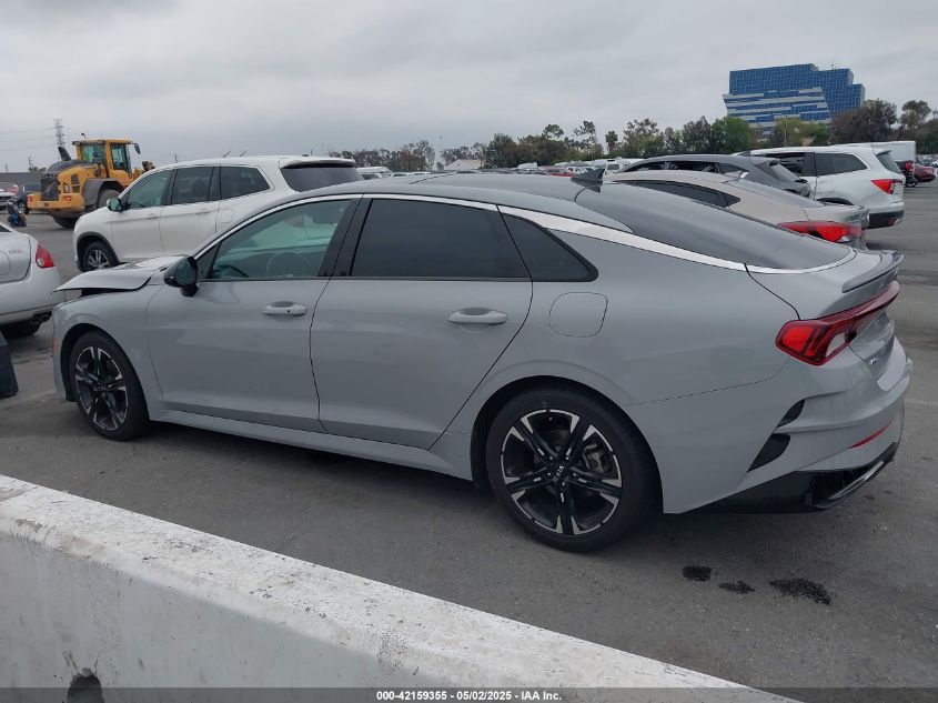 Inside, the K5 boasts a sleek, tech-forward cabin layout. Base trims feature high-quality cloth with satin metallic trim, while GT-Line and EX add SynTex leatherette with red stitching or two-tone color schemes. The GT model upgrades to sport bucket seats with GT embossing, a flat-bottom steering wheel, aluminum pedals, and contrast piping. Dual 10.25-inch displays (one for the instrument cluster and one for infotainment) are available, seamlessly integrated into a curved dash. Ambient lighting, panoramic sunroof, and ventilated seats add upscale touches.