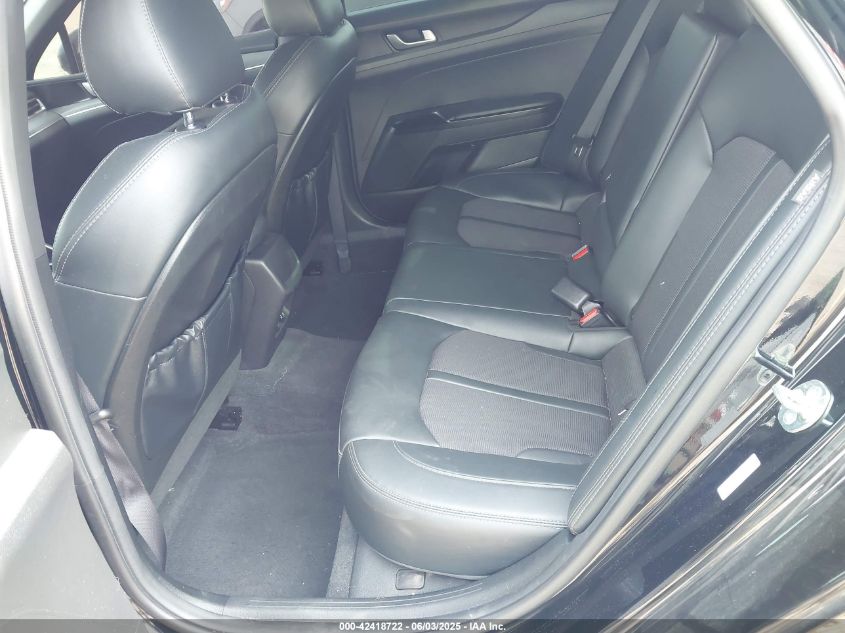 The Kia K5 is a four-door midsize fastback sedan with a bold and athletic profile. It features a sloping roofline, wide front fascia, and sculpted body panels that give it a near-coupe appearance without compromising practicality. The “tiger face” grille seamlessly integrates with the daytime running lights, which stretch deep into the front fenders like lightning bolts. A strong shoulder line, flared rear fenders, and a full-width LED light bar at the rear emphasize its wide stance. Dual exhaust outlets and black exterior trim in GT models further enhance the performance aesthetic. Despite its aggressive styling, rear headroom and trunk space remain generous due to clever packaging.