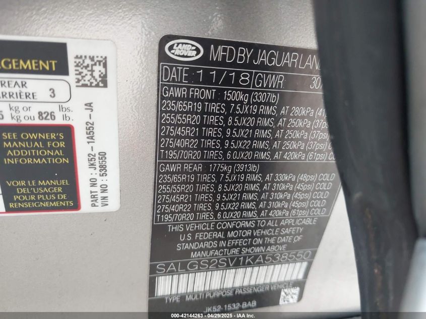2019 LAND ROVER RANGE ROVER | SALGS2SV1KA538550