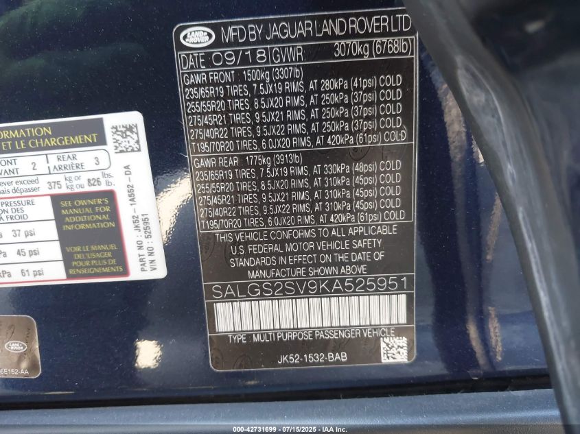 2019 LAND ROVER RANGE ROVER | SALGS2SV9KA525951