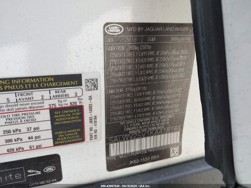 2019 LAND ROVER RANGE ROVER SPORT | SALWV2SV1KA418184