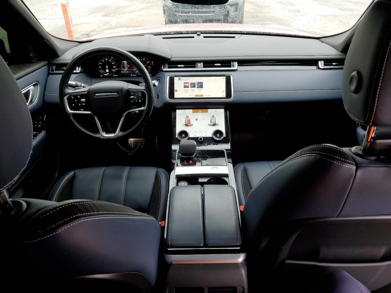 Inside, the Velar offers a spectrum of materials and color combinations that reflect its position as a design icon within the Range Rover family. Standard interiors include leatherette or grained leather in shades like Ebony, Light Oyster, or Acorn, often with monotone or two-tone execution and brushed aluminum trim. Higher trims such as the R-Dynamic HSE and Autobiography offer Windsor leather, Kvadrat wool-blend textiles, and Ultrafabrics™, paired with suedecloth headliners, natural ash veneers, shadow aluminum, or open-pore carbon fiber. Colorways such as Ebony/Light Oyster, Vintage Tan, Cloud/Ebony, and Deep Garnet are available in different configurations, often with contrast stitching, perforated patterns, and embroidered logos. Configurable ambient lighting and a floating dual-screen layout (Touch Pro Duo) contribute to the Velar’s serene, architectural feel.