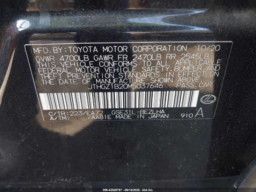 2021 LEXUS IS | JTHGZ1B20M5037646