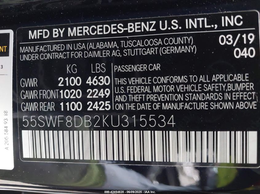 2019 MERCEDES-BENZ C-CLASS | 55SWF8DB2KU315534