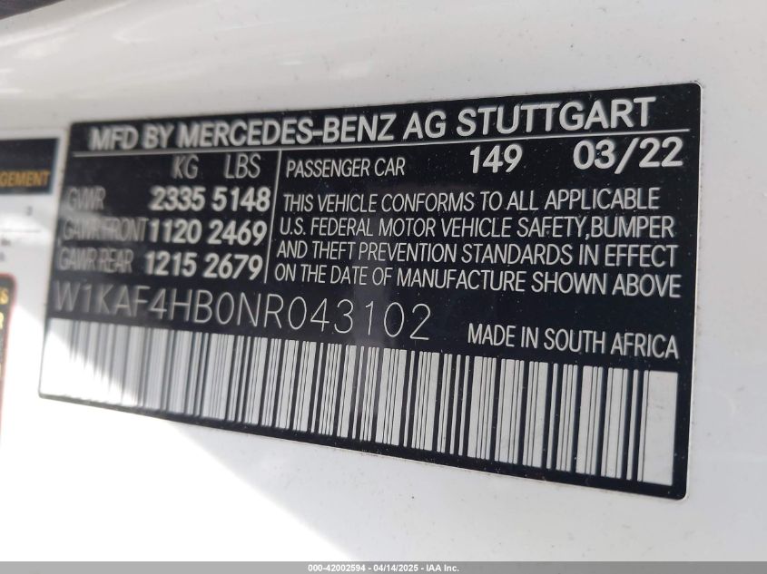 2022 MERCEDES-BENZ C-CLASS | W1KAF4HB0NR043102
