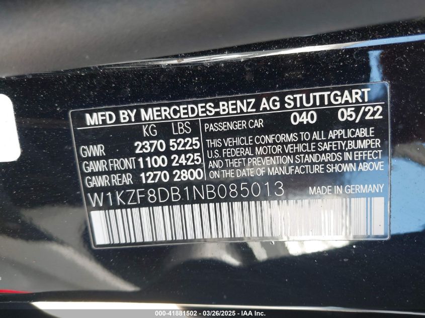 2022 MERCEDES-BENZ E-CLASS | W1KZF8DB1NB085013