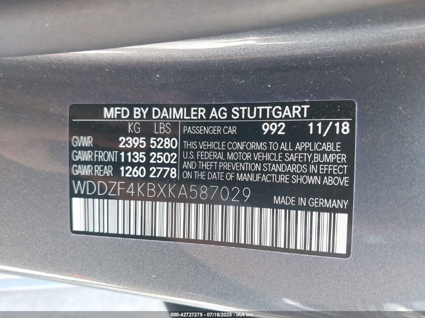 2019 MERCEDES-BENZ E-CLASS | WDDZF4KBXKA587029