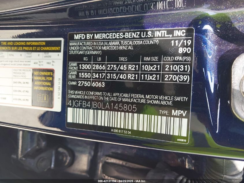 2020 MERCEDES-BENZ GLE-CLASS | 4JGFB4JB0LA145805