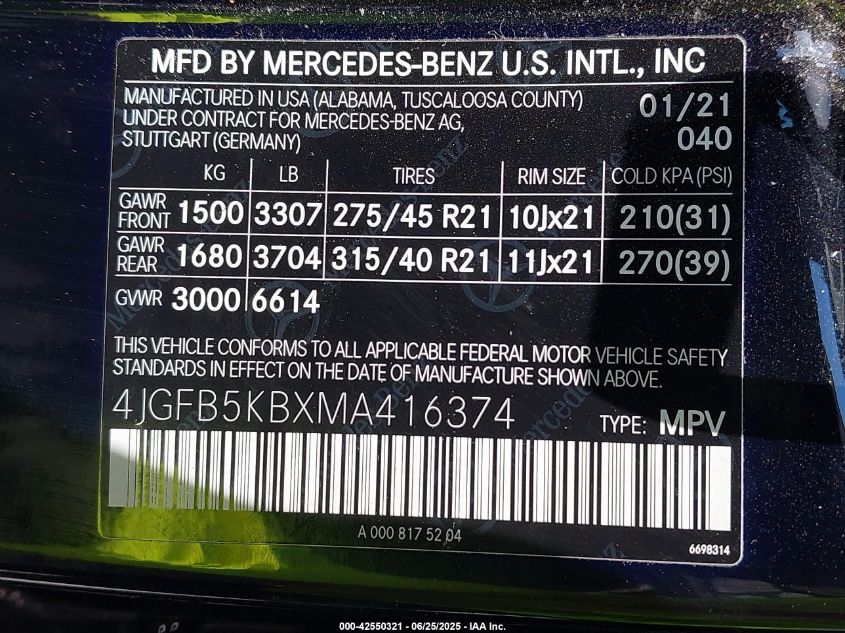 2021 MERCEDES-BENZ GLE-CLASS | 4JGFB5KBXMA416374