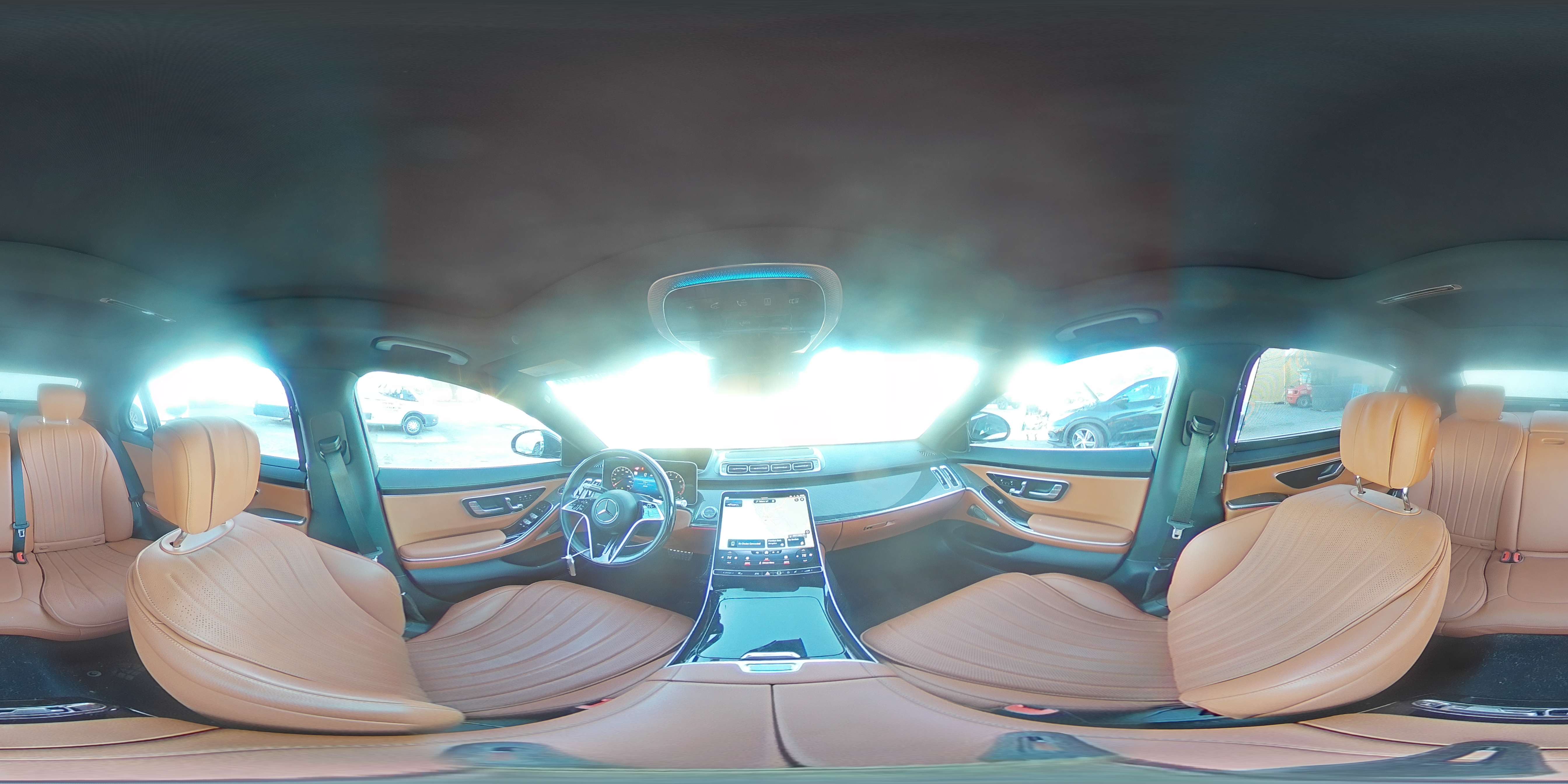 The W223 features a multi-screen dashboard with a 12.3” 3D digital cluster and 12.8” OLED center touchscreen. Materials range from Artico leatherette (base Europe) to full Nappa leather, with ambient lighting in 64 or 253 colors. Maybach cabins add rear executive reclining seats, massage programs, Maybach-exclusive leather quilting, piano lacquer wood trim, and rose gold detailing. Pullman interiors are tailored to diplomatic transport, with partitioned glass, conference seating, rear command panels, and hand-finished embroidery.
