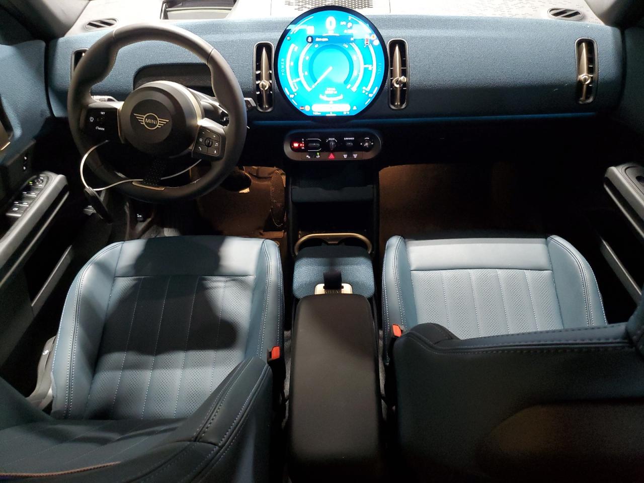 Inside, the 2024 Countryman features a completely reimagined cabin with a more minimalist layout and sustainably sourced materials. The dashboard is wrapped in textile surfaces made from recycled fibers, available in muted tones like Sage Green, Dark Petrol, or Warm Grey, depending on trim. The seats are finished in Vescin, MINI’s new high-end synthetic leather, or in knitted fabric with premium stitching, emphasizing both tactile quality and environmental responsibility. Interior color schemes vary by trim — the Classic style offers refined simplicity, Favoured adds warmth and contrast, and JCW brings sportier tones such as Black with Red accents. Ambient LED lighting runs across the dash and doors, adapting to drive mode and enhancing the modern, lounge-like atmosphere. The large circular OLED central display becomes the cabin’s visual focal point, replacing traditional instrument clusters and infusing the interior with tech-forward character.