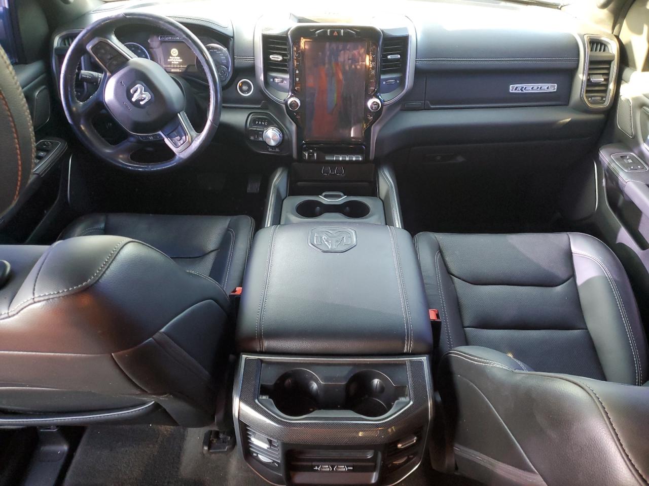 Interior options range from durable vinyl (Tradesman) to premium Natura Plus leather (Limited), with wood grain, real metal accents, and contrast stitching. The Laramie Longhorn features western saddle-themed interiors, while the Rebel offers sport-focused materials with red or black detailing.