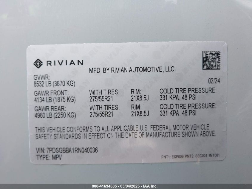 2024 RIVIAN R1S | 7PDSGBBA1RN040036
