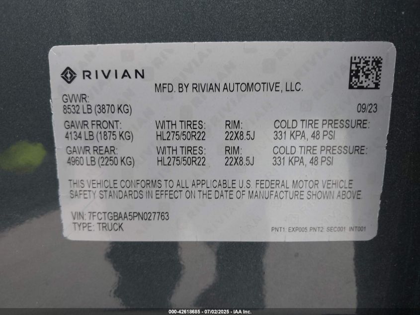 2023 RIVIAN R1T | 7FCTGBAA5PN027763